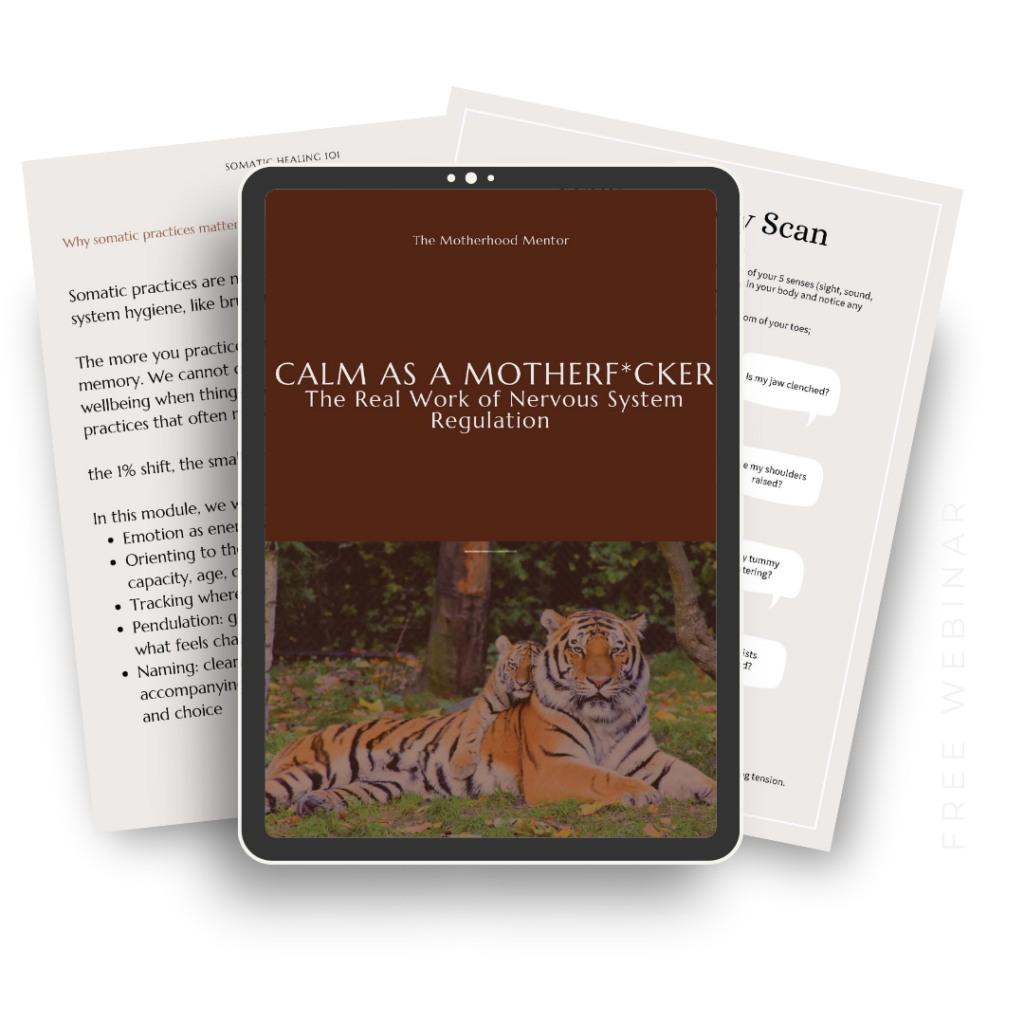 In this free workshop, Calm as a MotherFcker: The Real Work of Regulation in Motherhood*, you’ll learn practical, relational nervous system tools to help you stay grounded, present, and wildly alive. Even when motherhood gets messy.
